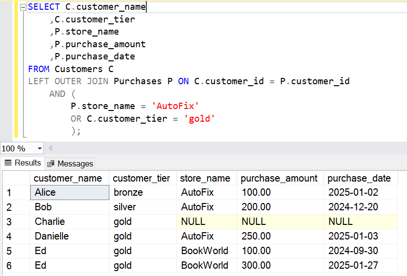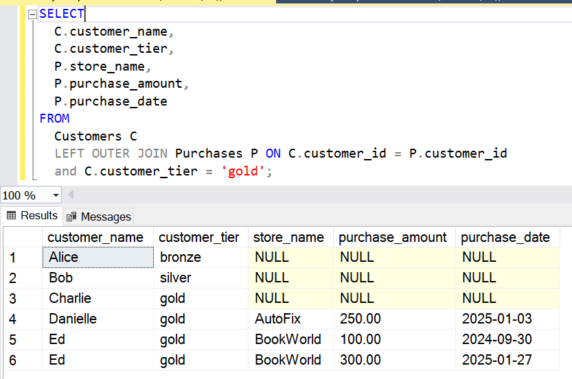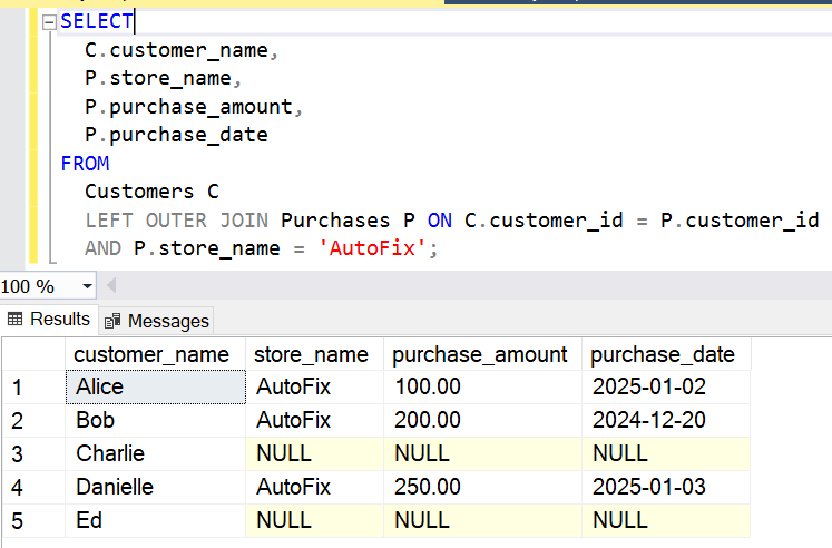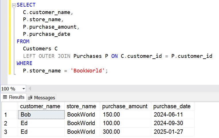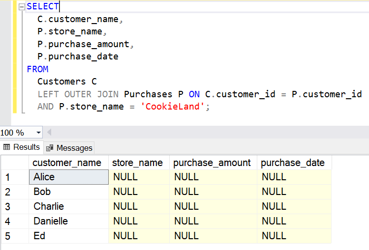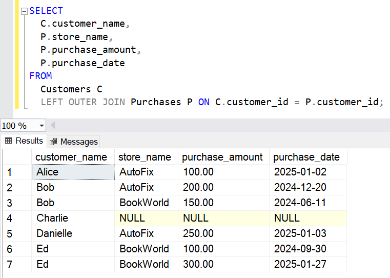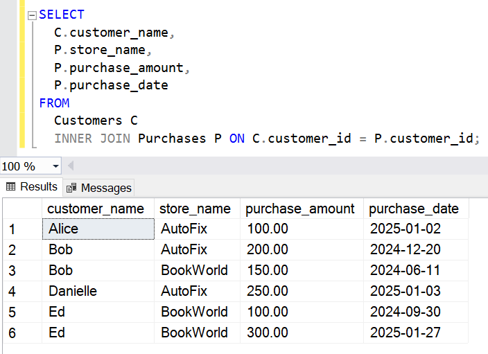 The result is a list of all customers who have made purchases. Note that Charlie isn’t in this list, because he hasn’t purchased anything yet.